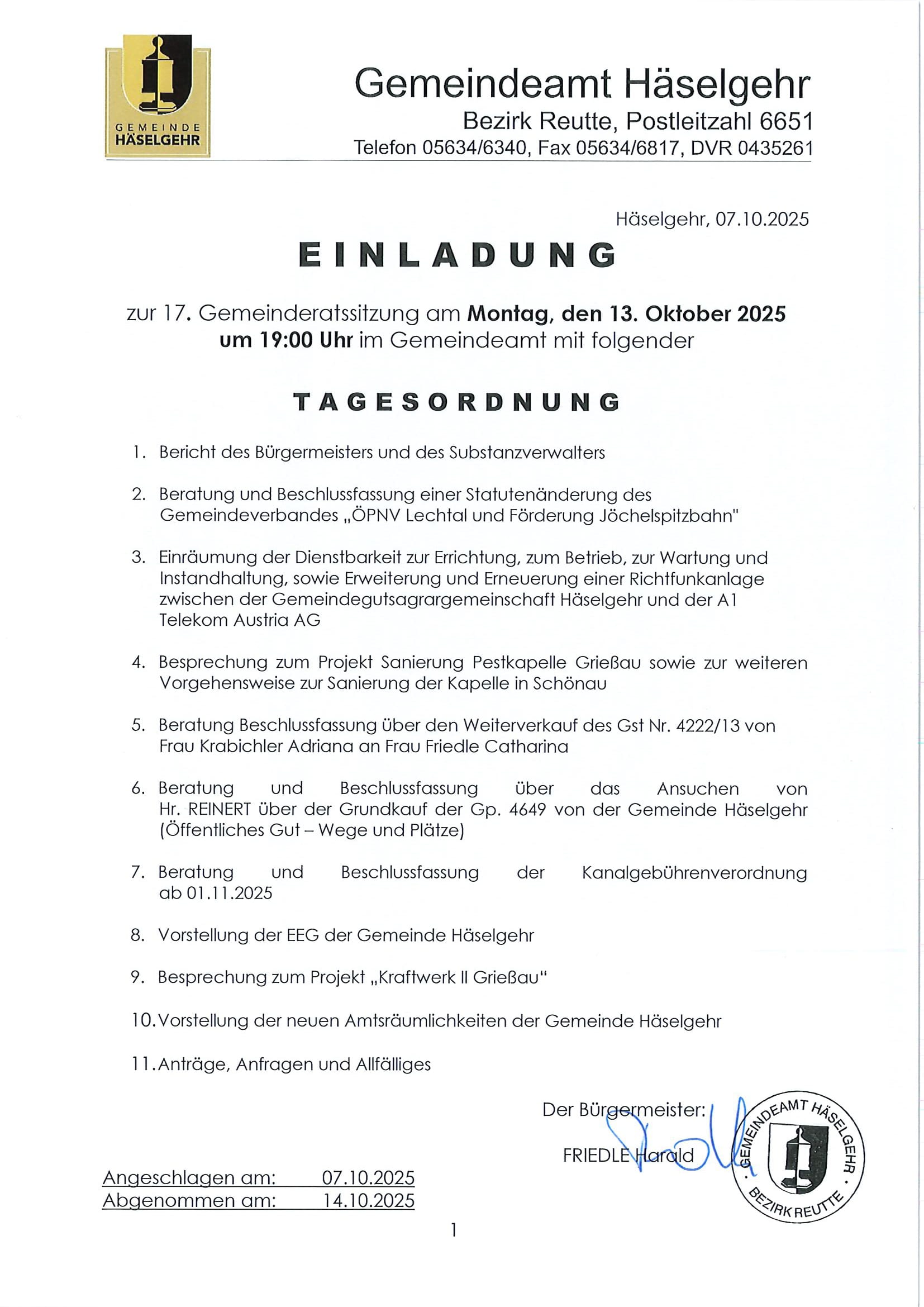 Einladung zur 17. Gemeinderatssitzung am 13.10.2025 7. Oktober 2025Allgemein, Gemeinde NewsGemeinde Häselgehr
