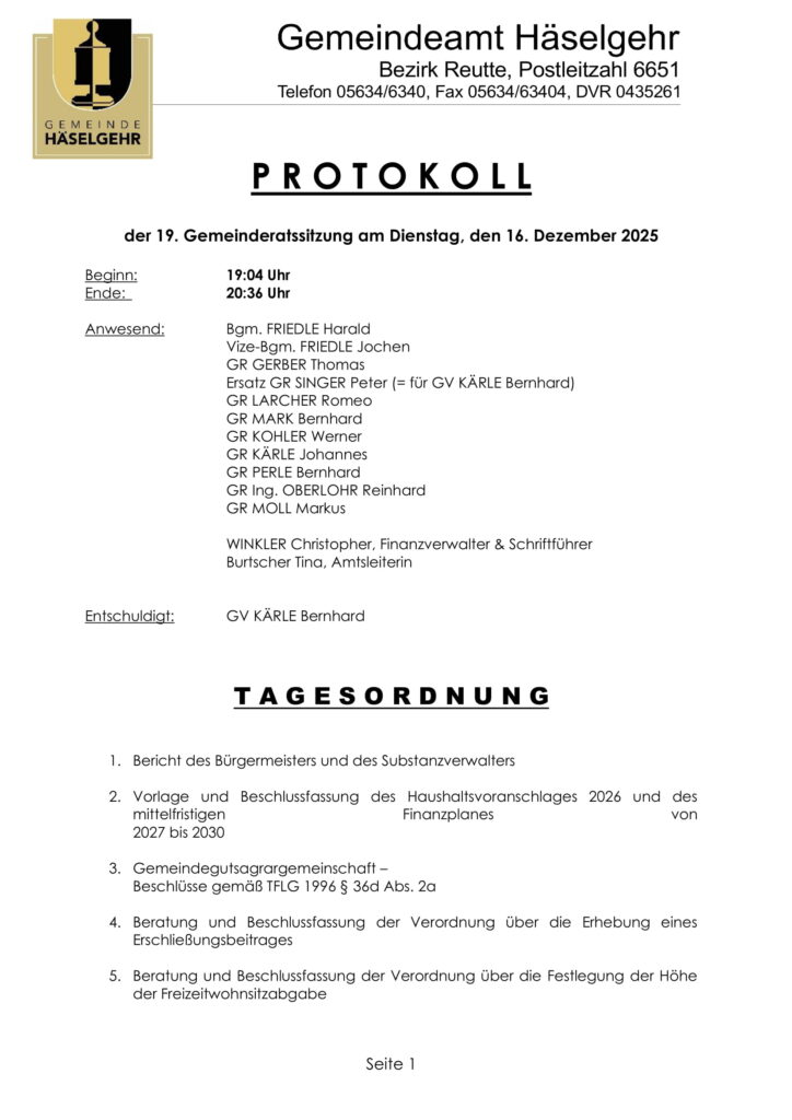 Protokoll der 19. Gemeinderatssitzung am 16.12.2025 10. Dezember 2025Allgemein, Gemeinde NewsGemeinde Häselgehr