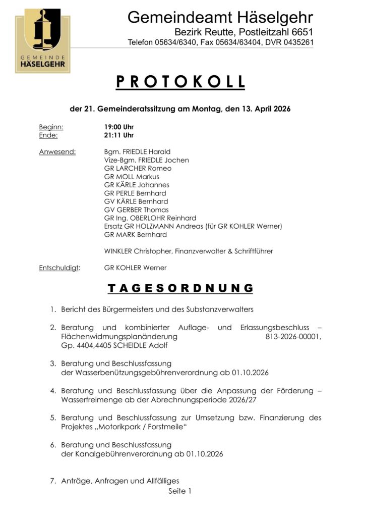 Protokoll der 21. GR Sitzung am 13.04.2026