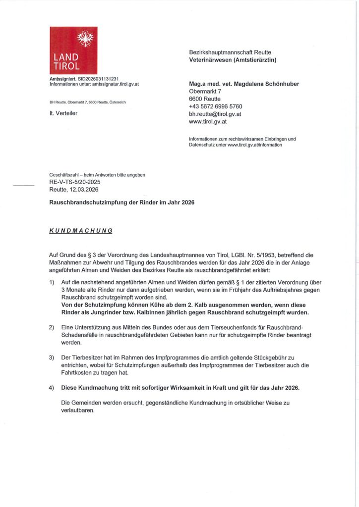 Kundmachung Rauschbrandschutzimpfung der Rinder im Jahr 2026