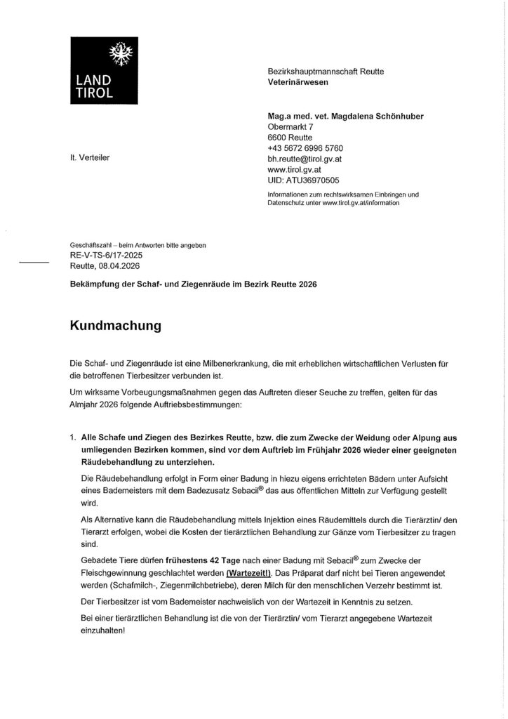 Kundmachung - Bekämpfung der Schaf- und Ziegenräude im Bezirk Reutte 2026