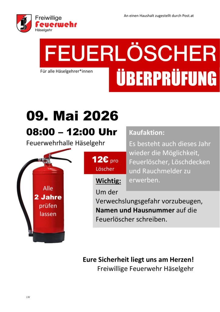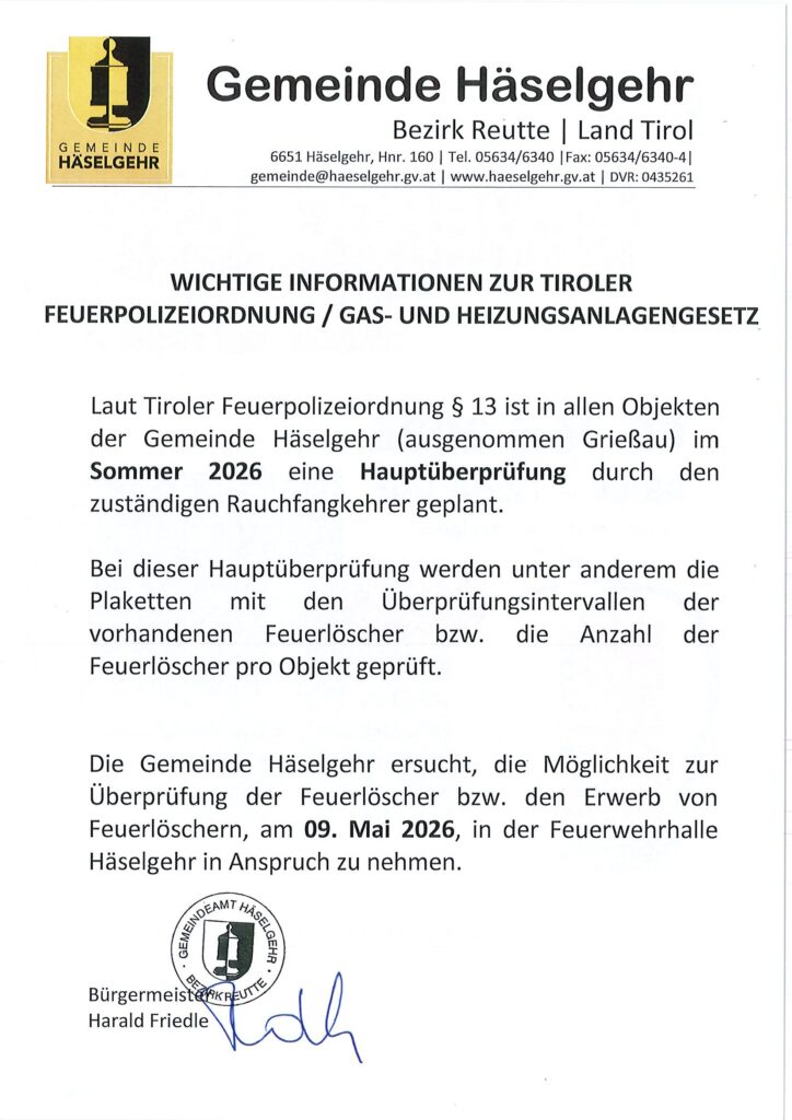 Info Hauptüberprüfung Feuerpolizei und Feuerlöscherüberprüfung durch die FFW Häselgehr 14. April 2026Allgemein, Gemeinde NewsGemeinde Häselgehr